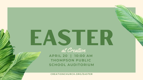 We're inviting you to a special Easter Service on Sunday April 20 @ 10 AM at the Thompson Public School Auditorium. We believe that the Good News of Jesus Christ is Good News for everyone. God is not angry with you! He loves you and has an incredible plan for each of our lives. This Easter Sunday we are going to have a celebration, with songs, an encouraging speaker and a special family photo booth. Please plan to join us!